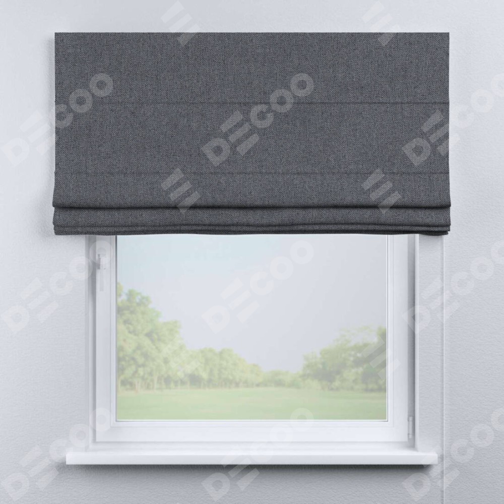 Классическая римская штора производителя «Cortin», пошита из ткани лён блэкаут тёмно-серый, артикул: 139663. Имеет универсальный механизм и подходит для монтажа: на потолок, на стену и в нишу.