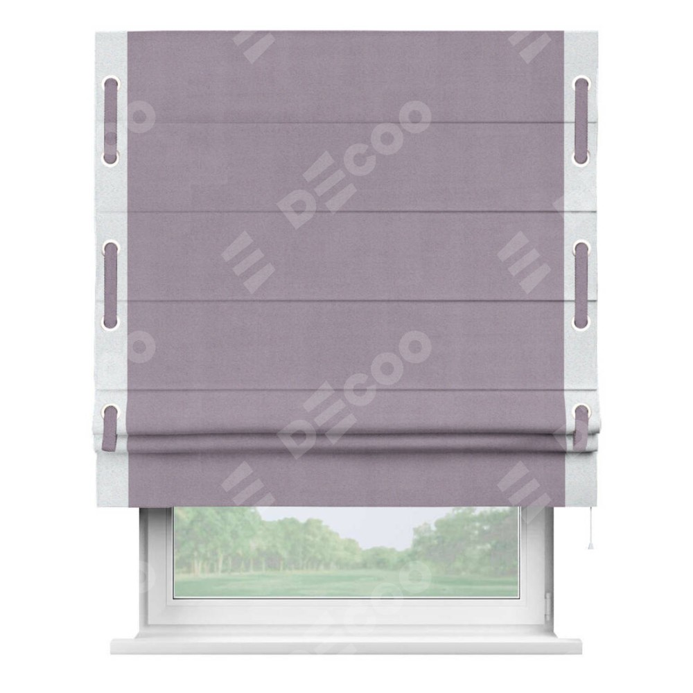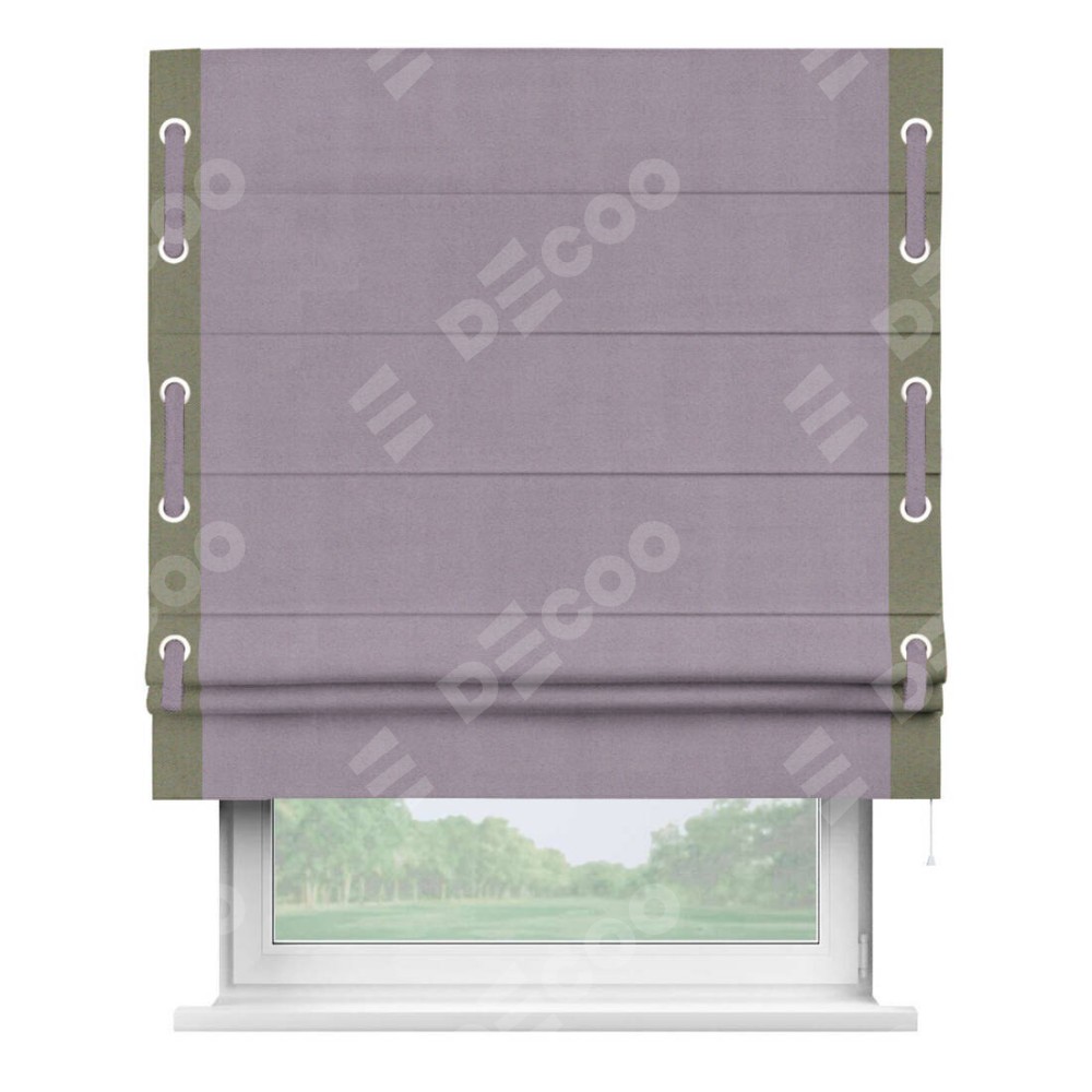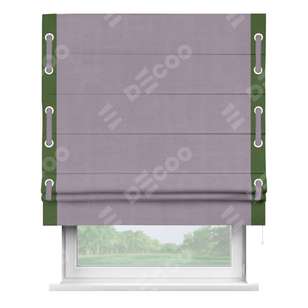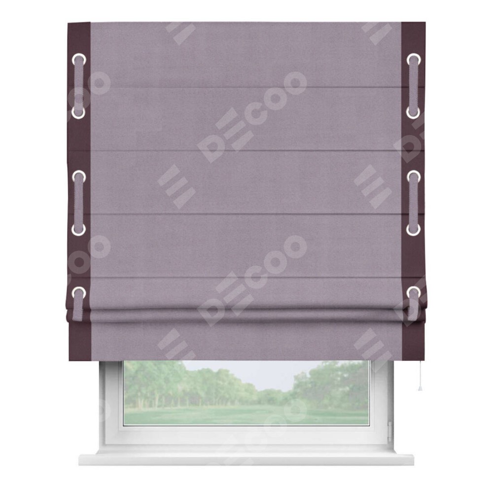 Римская штора «Кортин» для проёма, блэкаут однотонный лиловый с кантом Стрим Дуо (люверсы с пояском)
