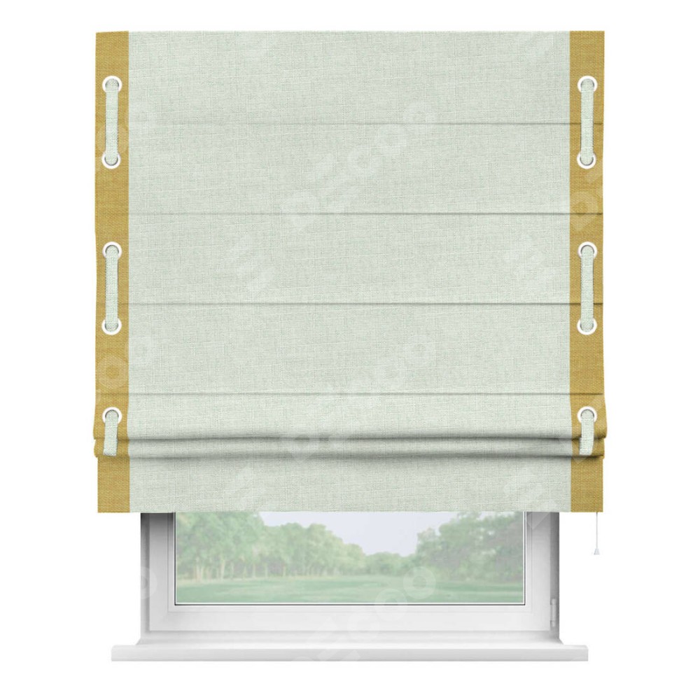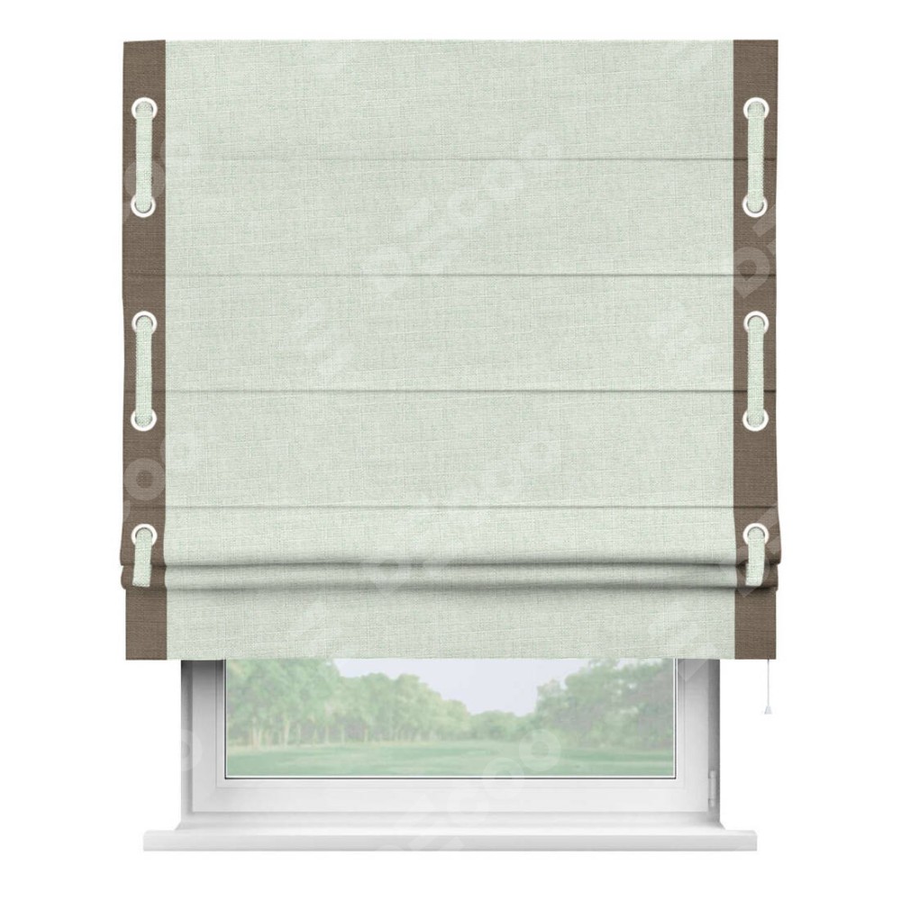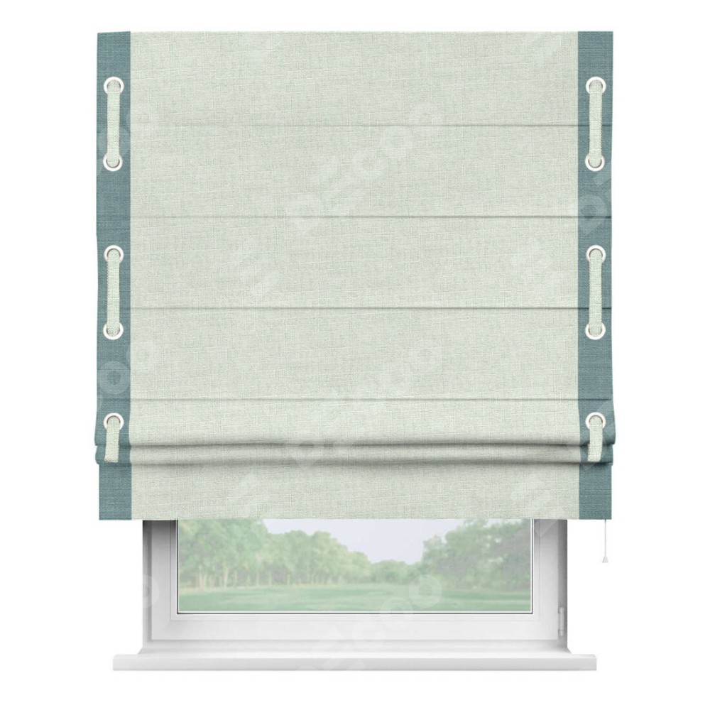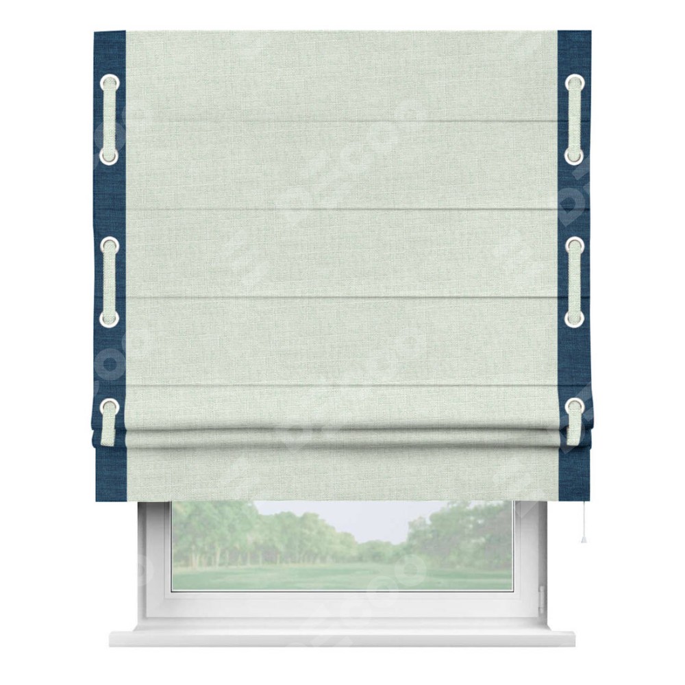 Римская штора «Кортин» для проёма, лён топлёное молоко, с кантом Стрим Дуо (люверсы с пояском)