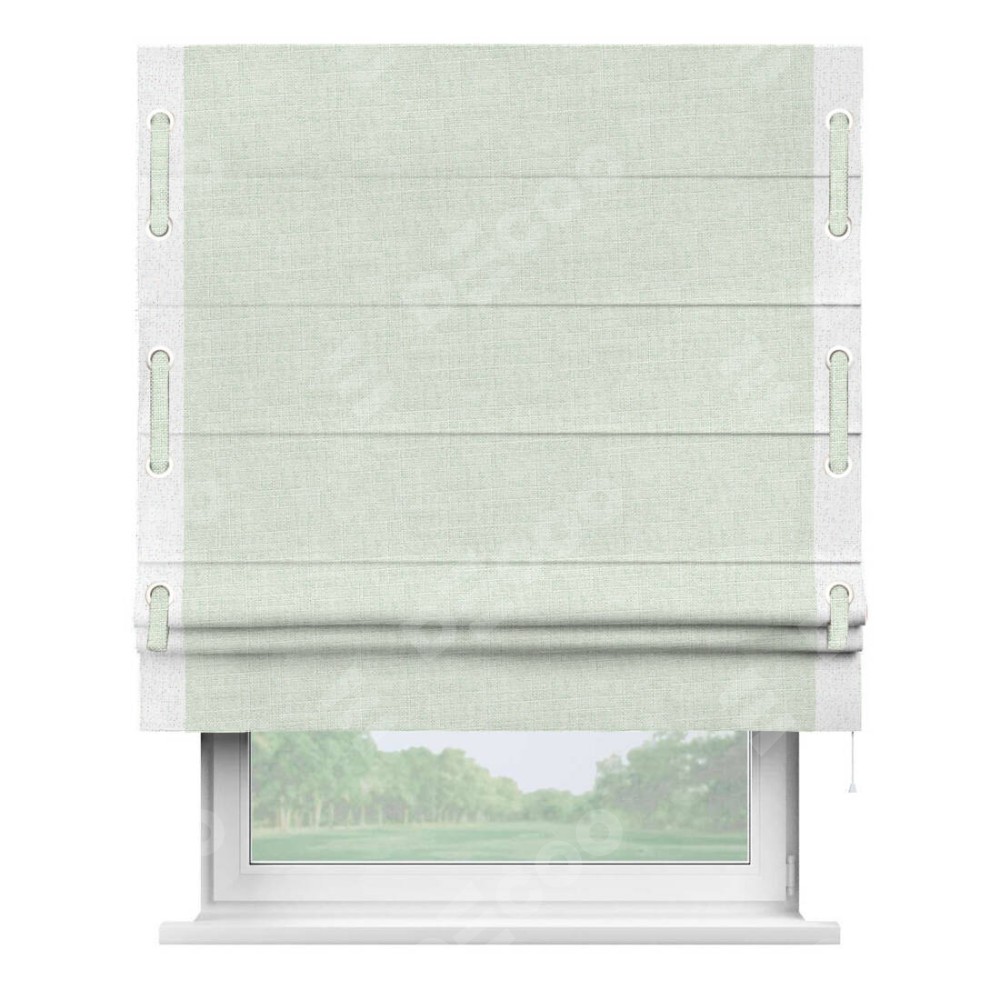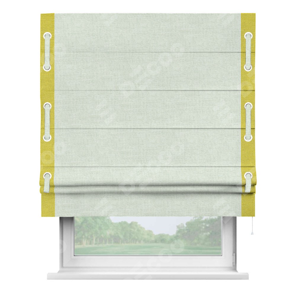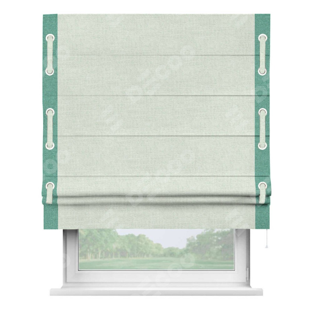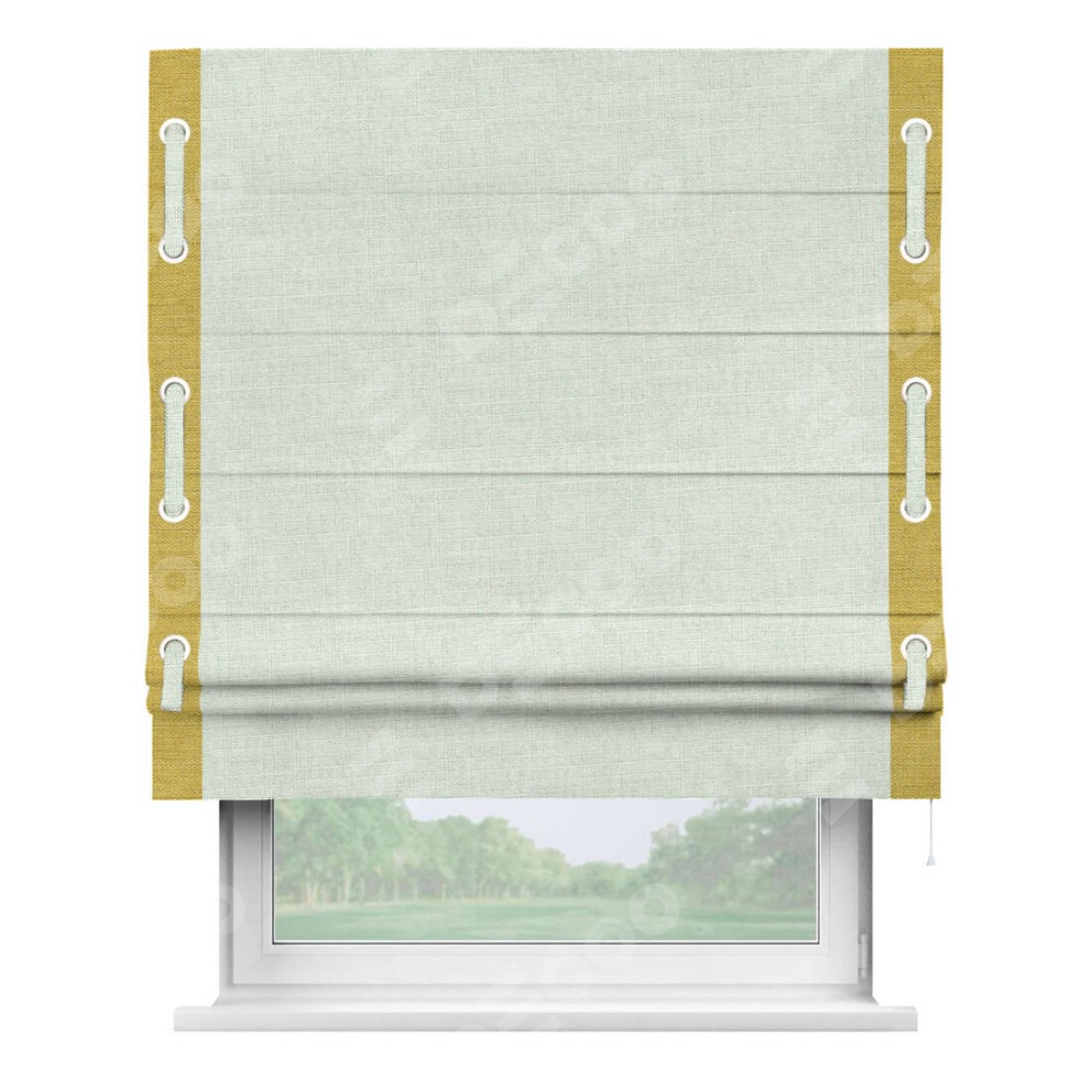 Римская штора «Кортин» для проёма, лён топлёное молоко, с кантом Стрим Дуо (люверсы с пояском)