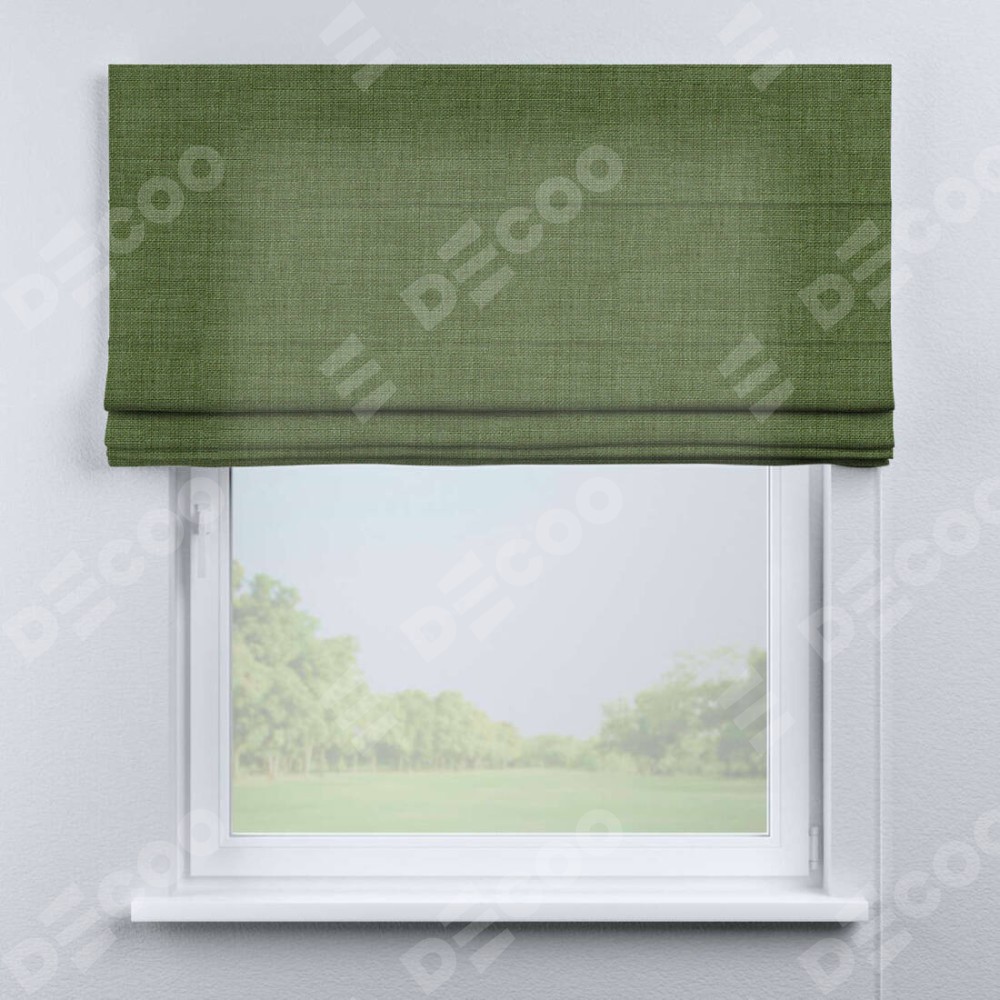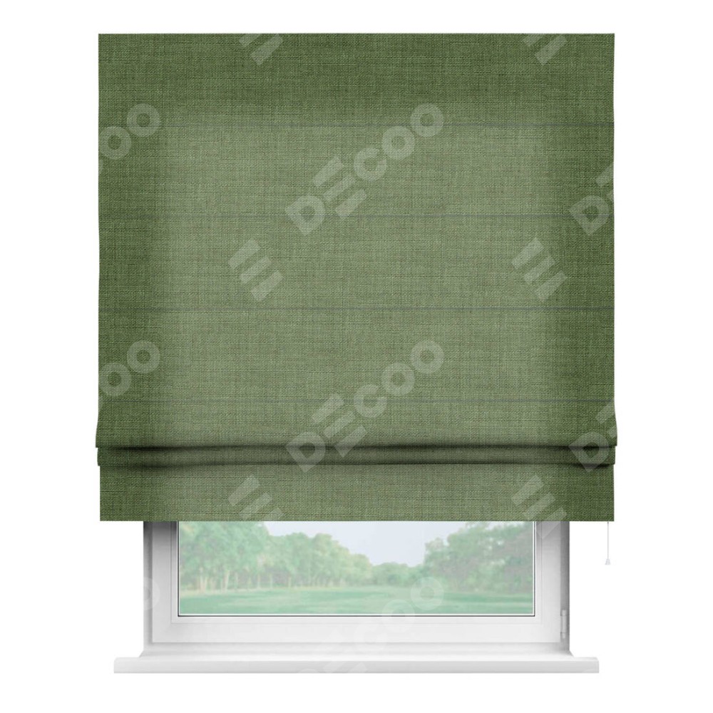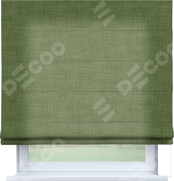 Классическая римская штора производителя «Cortin», пошита из ткани лён зелёный, артикул: 131547. Имеет универсальный механизм и подходит для монтажа: на потолок, на стену и в нишу.