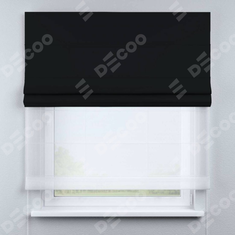 Двойная римская штора «День-ночь» от производителя Cortin предназначена для использования в проёмах. Эта штора уникальна тем, что состоит из двух полотен. На лицевой стороне находится однотонный блэкаут черный (артикул: 37), обеспечивающий эффективное затемнение. В комплект также входит вторая ткань — легкий белый тюль (артикул: V-01), который добавляет изящества и легкости оформлению окна. Кроме того, доступны и другие разновидности ткани тюль, выбор которых доступен по  ссылке .