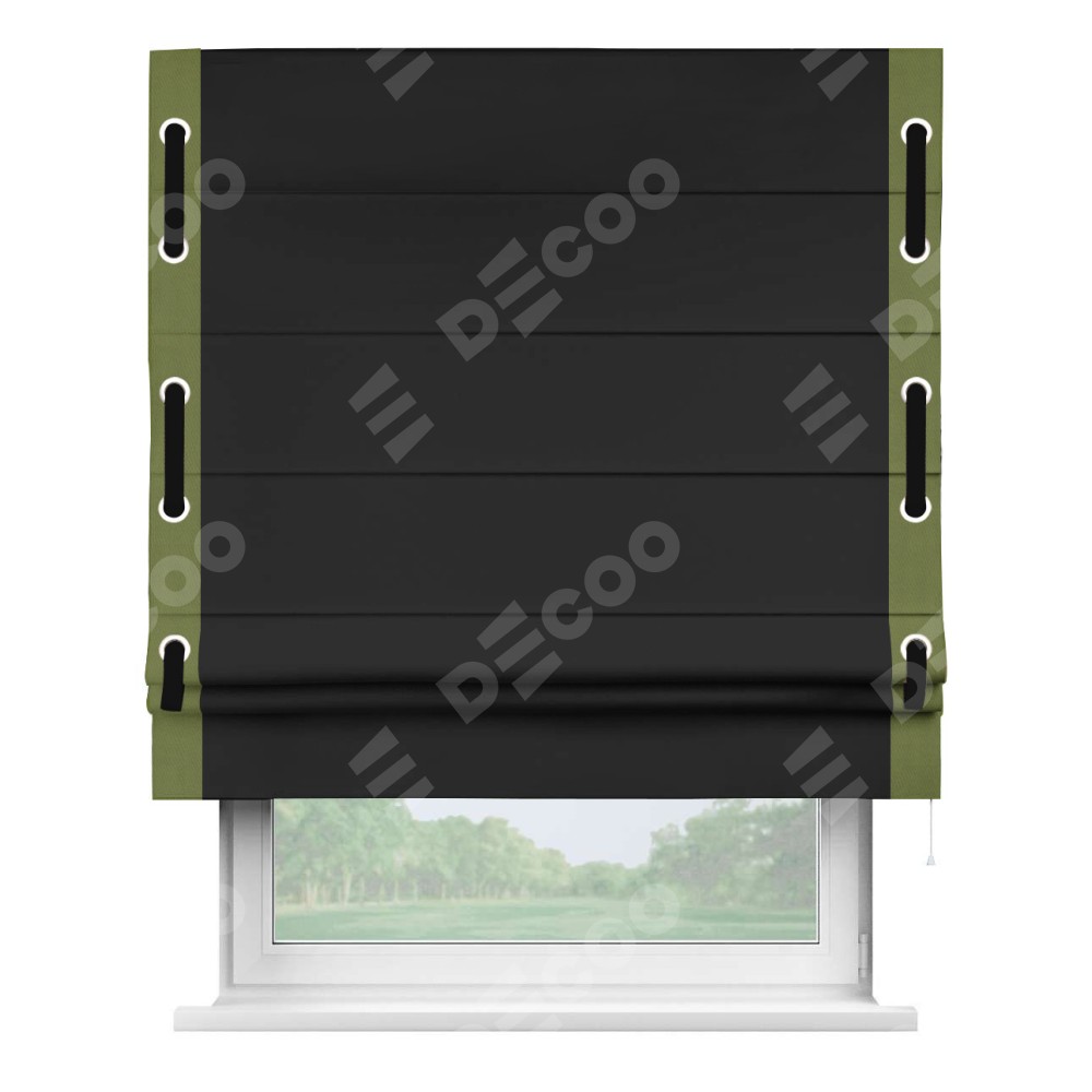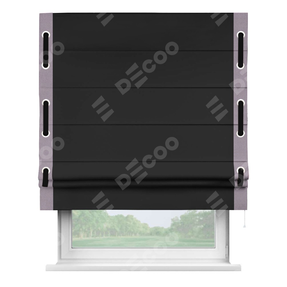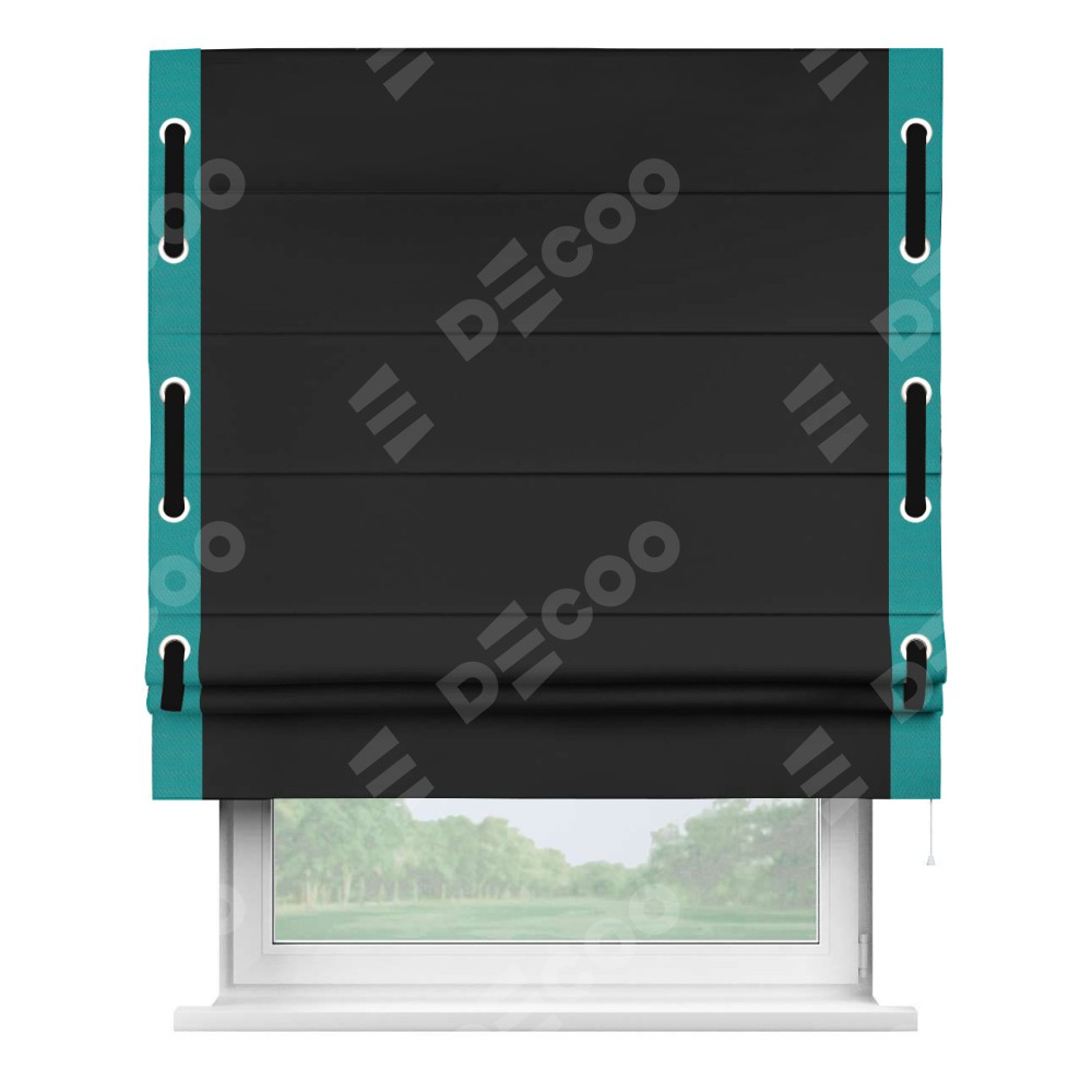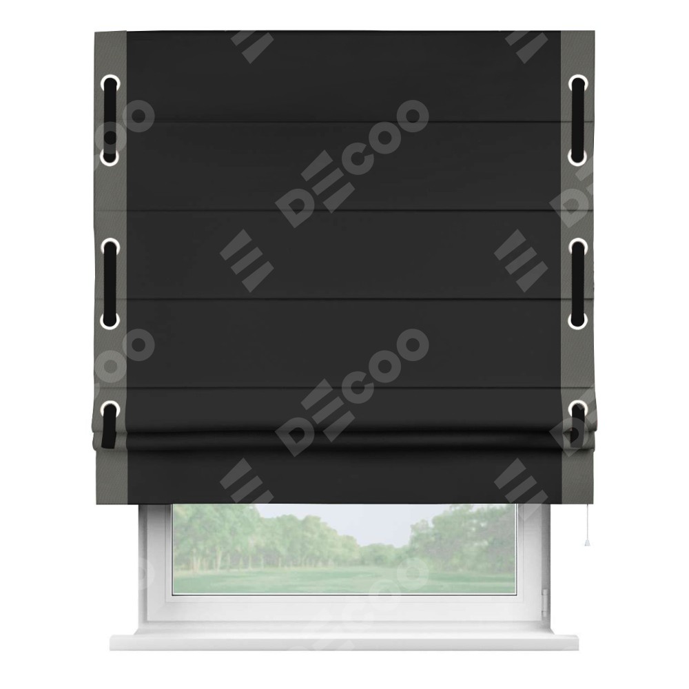 Римская штора «Cortin» для проёма, блэкаут однотонный черный с кантом Стрим Дуо (люверсы с пояском)