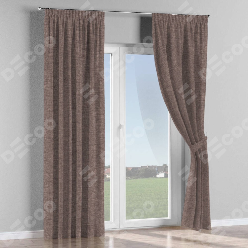Готовые шторы от производителя «Cortin» представлены комплектом из двух одинаковых по размеру полотен, пошитых из ткани рогожка димаут коричневый, артикул ткани 80420. Такие шторы по сравнению с индивидуальным пошивом имеют ряд преимуществ: удобный размерный ряд под стандартные проёмы, стоимость и сроки (т.к. изделия всегда в наличии).