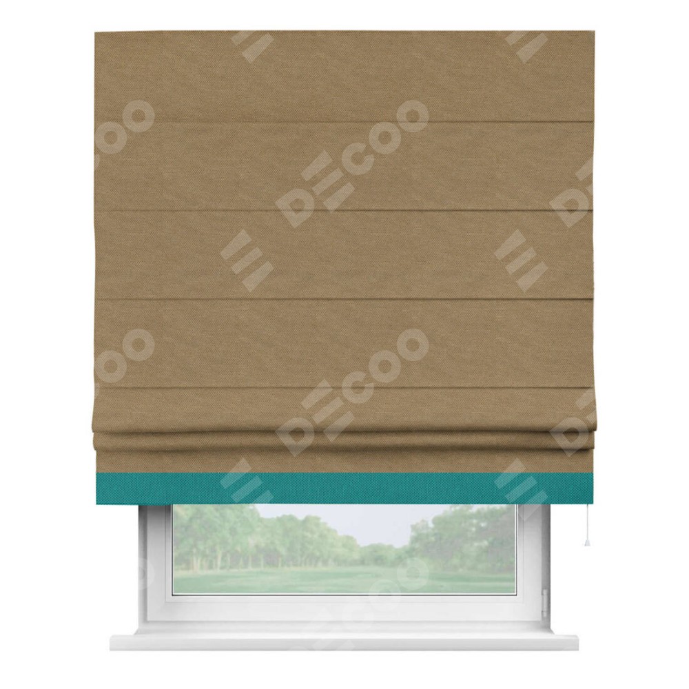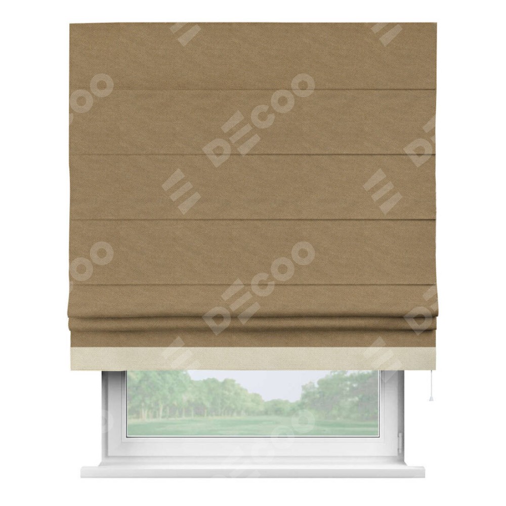 Римская штора производителя «Cortin», используется для проёма, пошита из ткани лён димаут коричневый, артикул 83026. Отделка шторы кантом «Джестер», ткань для канта используется из льна димаут разной расцветки на выбор. Имеет универсальный механизм и подходит для монтажа: на потолок, на стену и в нишу.