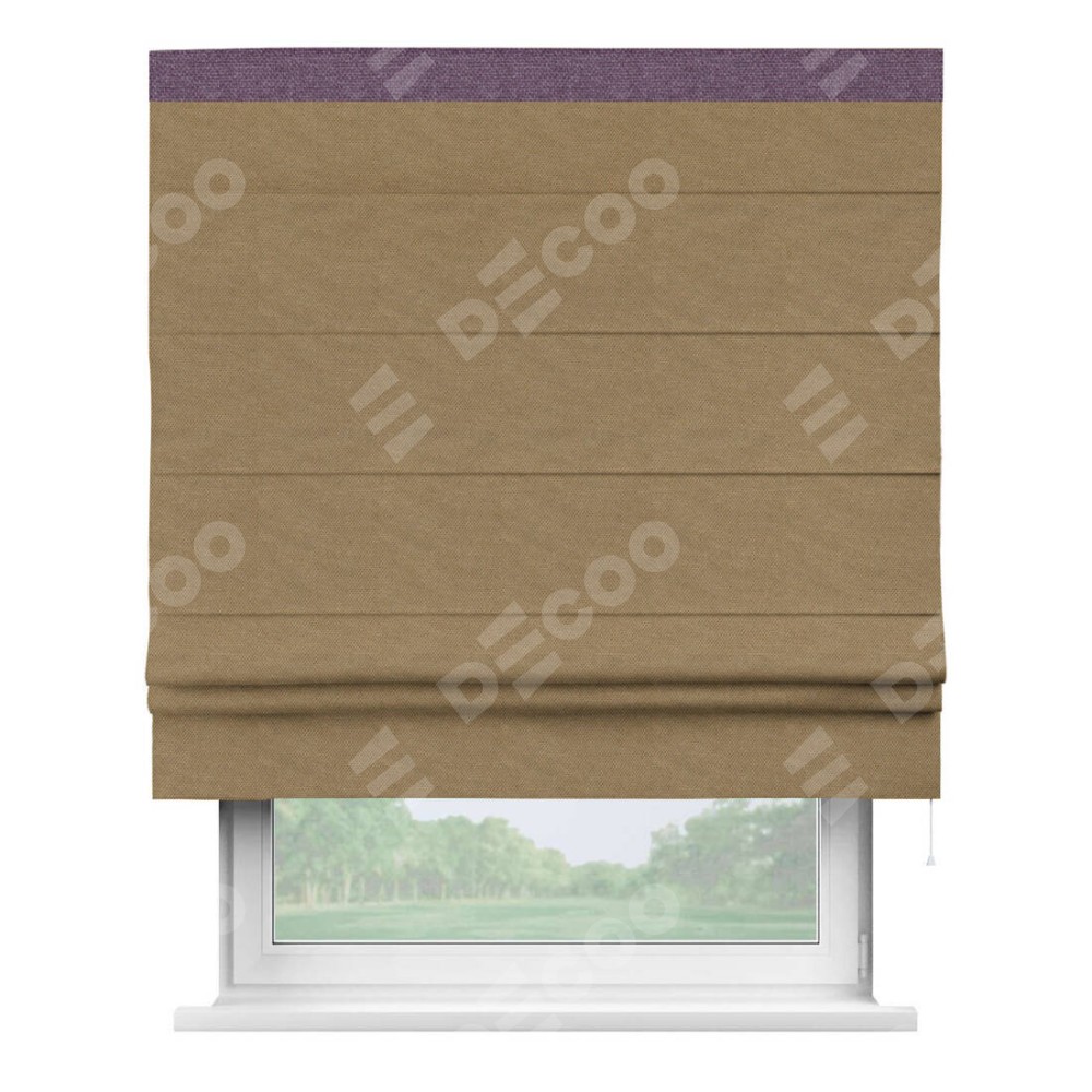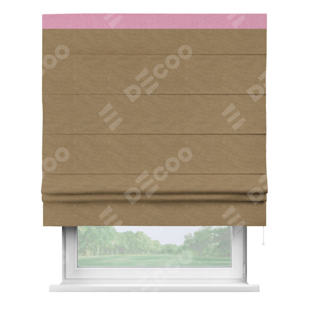 Римская штора производителя «Cortin», используется для проёма, пошита из ткани лён димаут Коричневый, артикул 83026. Отделка шторы кантом «Кинг», ткань для канта используется из льна димаут разной расцветки на выбор. Имеет универсальный механизм и подходит для монтажа: на потолок, на стену и в нишу.