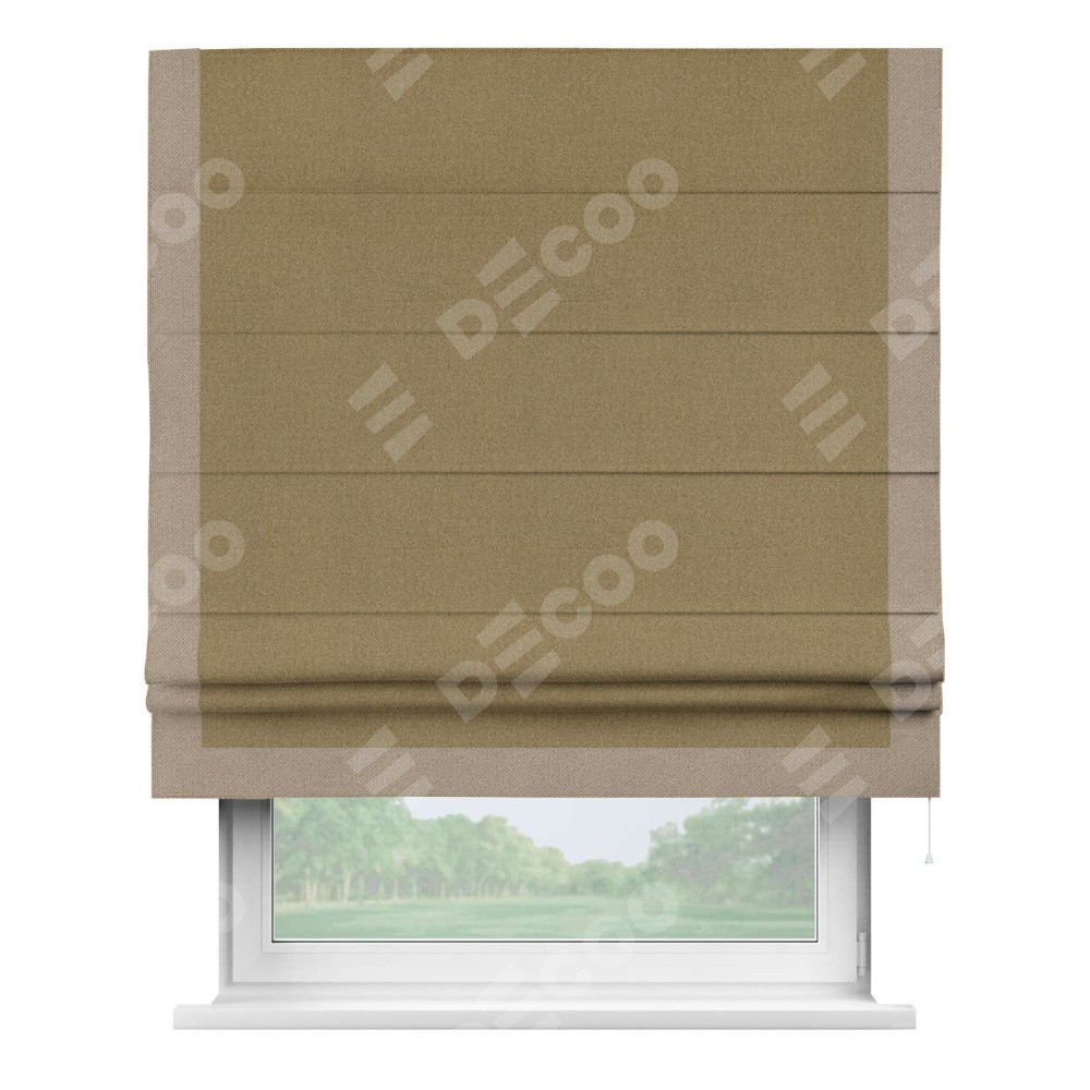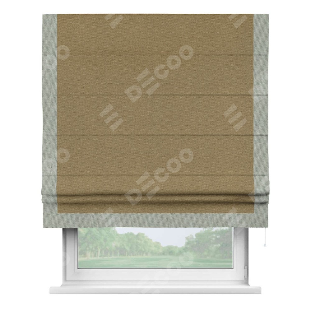 Римская штора производителя «Cortin», используется для проёма, пошита из ткани лён димаут оливковый, артикул 16243. Отделка шторы кантом «Виктория», ткань для канта используется из льна димаут разной расцветки на выбор. Имеет универсальный механизм и подходит для монтажа: на потолок, на стену и в нишу.