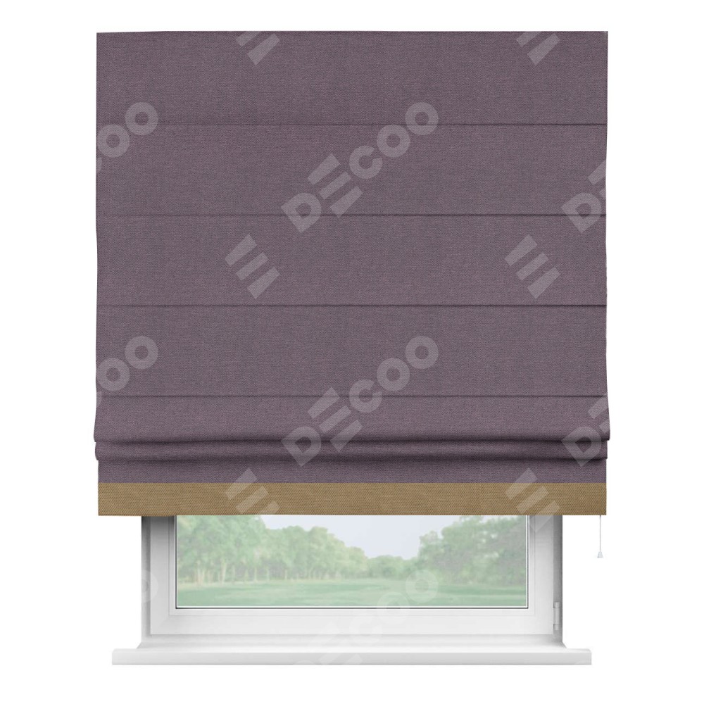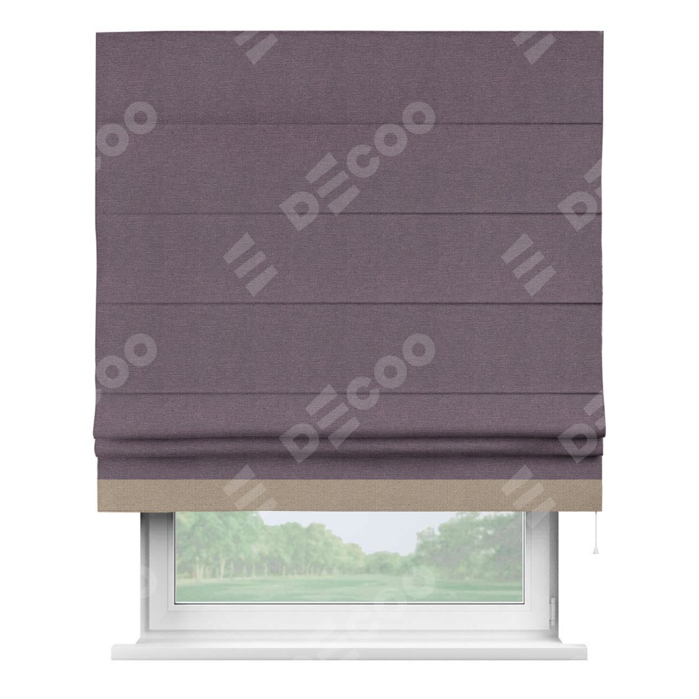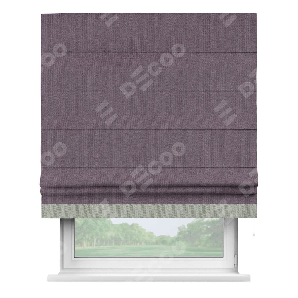 Римская штора производителя «Cortin», используется для проёма, пошита из ткани лён димаут светло-фиолетовый, артикул 83034. Отделка шторы кантом «Джестер», ткань для канта используется из льна димаут разной расцветки на выбор. Имеет универсальный механизм и подходит для монтажа: на потолок, на стену и в нишу.