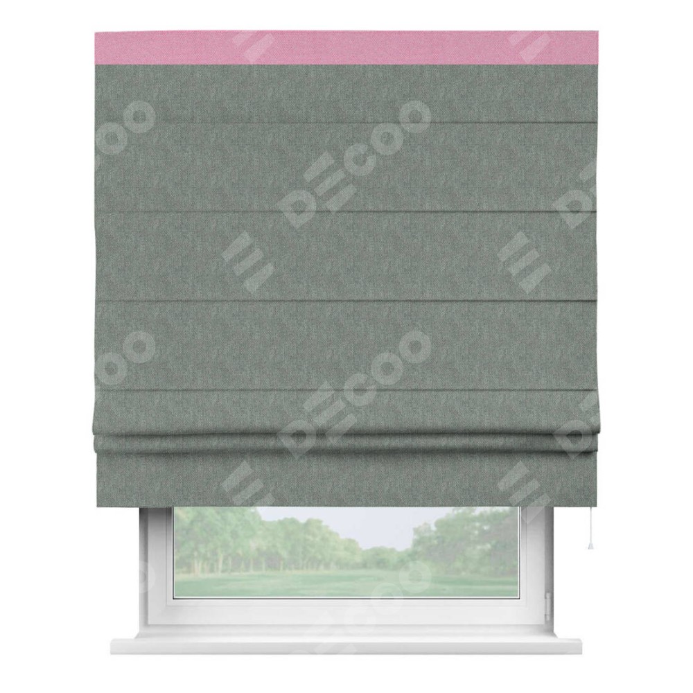 Римская штора производителя «Cortin», используется для проёма, пошита из ткани лён димаут серый, артикул 16240. Отделка шторы кантом «Кинг», ткань для канта используется из льна димаут разной расцветки на выбор. Имеет универсальный механизм и подходит для монтажа: на потолок, на стену и в нишу.