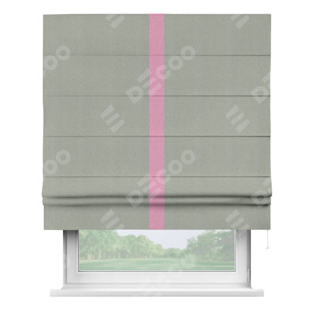 Римская штора производителя «Cortin», используется для проёма, пошита из ткани лён димаут серый, артикул ф3. Отделка шторы кантом «Хайвэй», ткань для канта используется из льна димаут разной расцветки на выбор. Имеет универсальный механизм и подходит для монтажа: на потолок, на стену и в нишу.