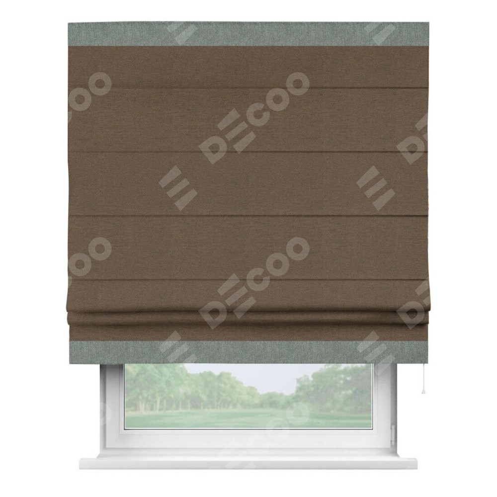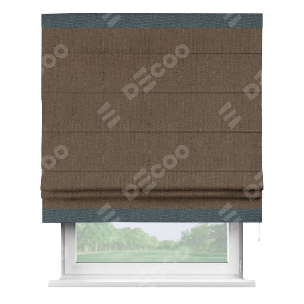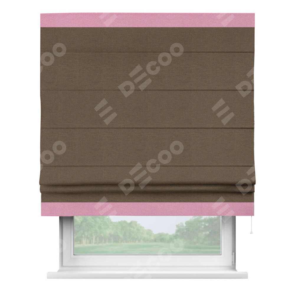 Римская штора производителя «Cortin», используется для проёма, пошита из ткани лён димаут тёмно-коричневый, артикул 83030. Отделка шторы кантом «Горизонт», ткань для канта используется из льна димаут разной расцветки на выбор. Имеет универсальный механизм и подходит для монтажа: на потолок, на стену и в нишу.