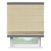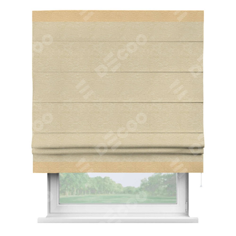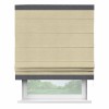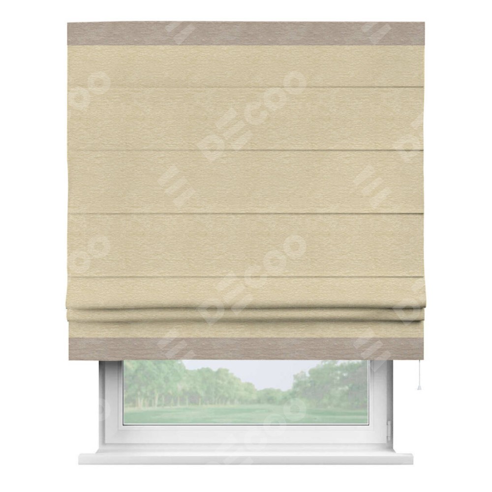 Римская штора производителя «Cortin», используется для проёма, пошита из ткани софт однотонный светло-бежевый, артикул 54426. Отделка шторы кантом «Горизонт», ткань для канта используется из софта разной расцветки на выбор. Имеет универсальный механизм и подходит для монтажа: на потолок, на стену и в нишу.