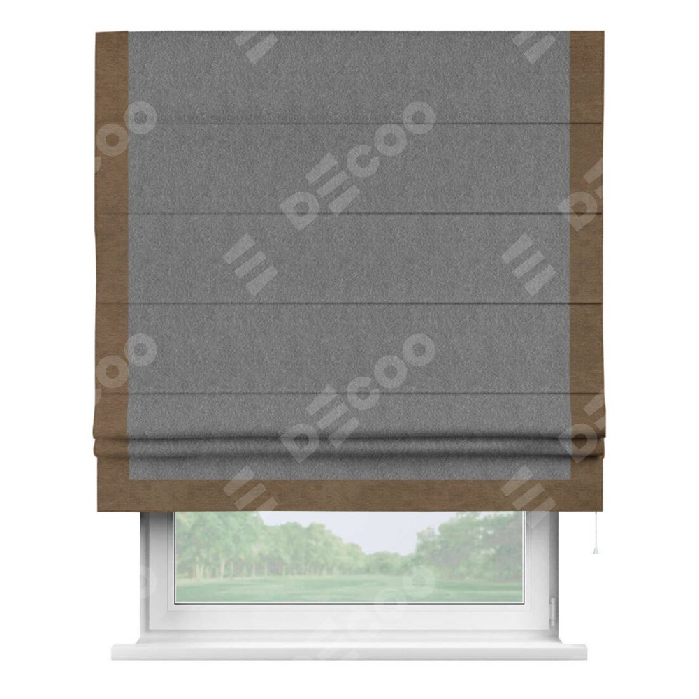 Римская штора производителя «Cortin», используется для проёма, пошита из ткани софт однотонный серый, артикул 70605. Отделка шторы кантом «Виктория», ткань для канта используется из софта разной расцветки на выбор. Имеет универсальный механизм и подходит для монтажа: на потолок, на стену и в нишу.