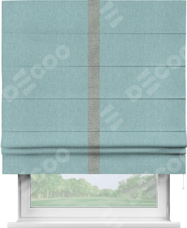 Римская штора производителя «Cortin», используется для проёма, пошита из ткани твид блэкаут небесно-голубой, артикул 21578. Отделка шторы кантом «Хайвэй», ткань для канта используется из твида разной расцветки на выбор. Имеет универсальный механизм и подходит для монтажа: на потолок, на стену и в нишу.