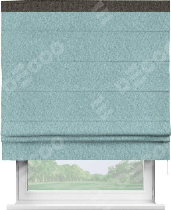 Римская штора производителя «Cortin», используется для проёма, пошита из ткани твид блэкаут небесно-голубой, артикул 21578. Отделка шторы кантом «Кинг», ткань для канта используется из твида разной расцветки на выбор. Имеет универсальный механизм и подходит для монтажа: на потолок, на стену и в нишу.