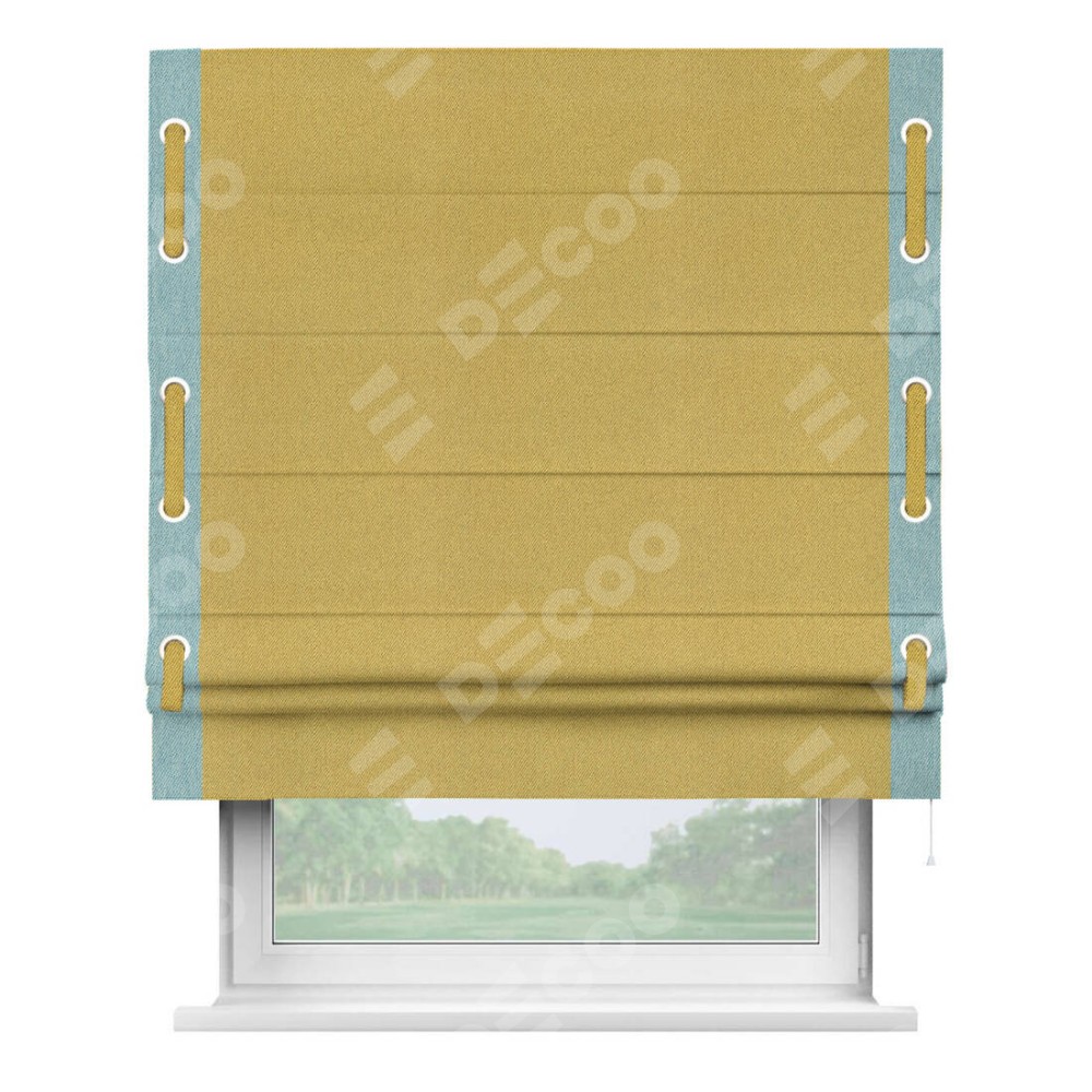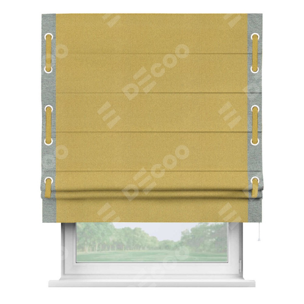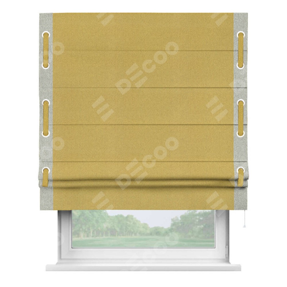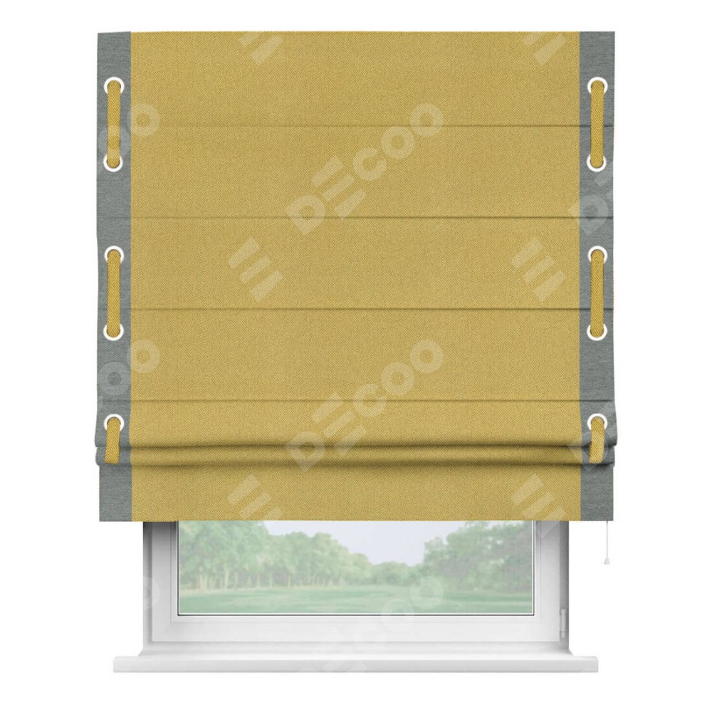 Римская штора производителя «Cortin», используется для проёма, пошита из ткани твид блэкаут пыльная горчица, артикул 21588. Отделка шторы кантом «Стрим Дуо» на кантах расположены люверсы с пояском, ткань для канта используется из твида разной расцветки на выбор. Ткань для пояска обычно используется из основной ткани шторы, а так же можно сделать из любой расцветки по желанию. Имеет универсальный механизм и подходит для монтажа: на потолок, на стену и в нишу.
