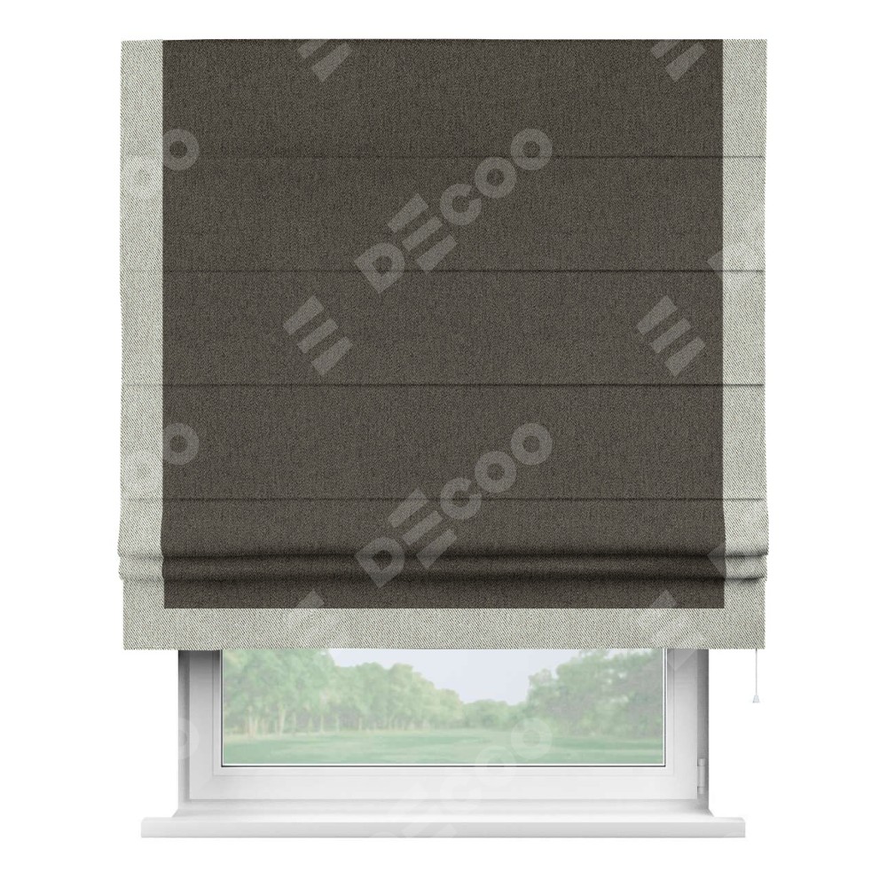 Римская штора производителя «Cortin», используется для проёма, пошита из ткани твид блэкаут тёмно-коричневый, артикул 21584. Отделка шторы кантом «Виктория», ткань для канта используется из твида разной расцветки на выбор. Имеет универсальный механизм и подходит для монтажа: на потолок, на стену и в нишу.