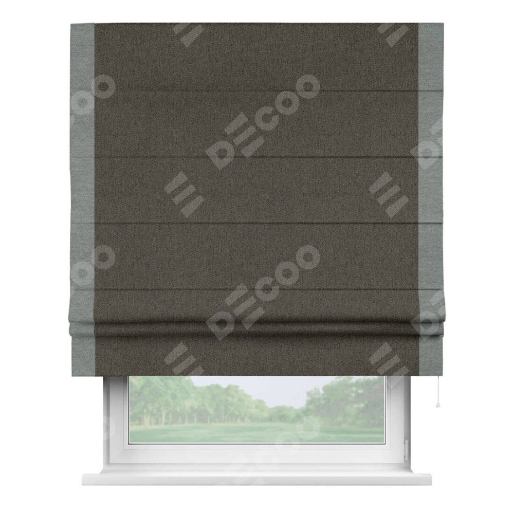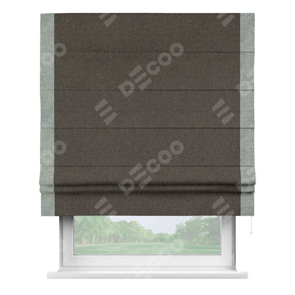 Римская штора производителя «Cortin», используется для проёма, пошита из ткани твид блэкаут тёмно-коричневый, артикул 21584. Отделка шторы кантом «Стрим Дуо», ткань для канта используется из твида разной расцветки на выбор. Имеет универсальный механизм и подходит для монтажа: на потолок, на стену и в нишу.