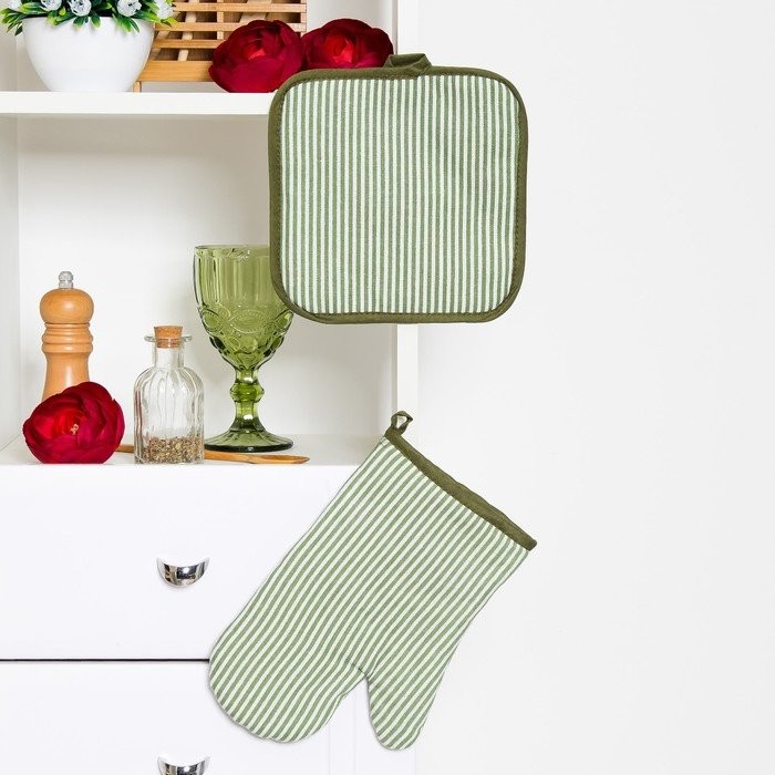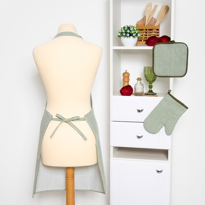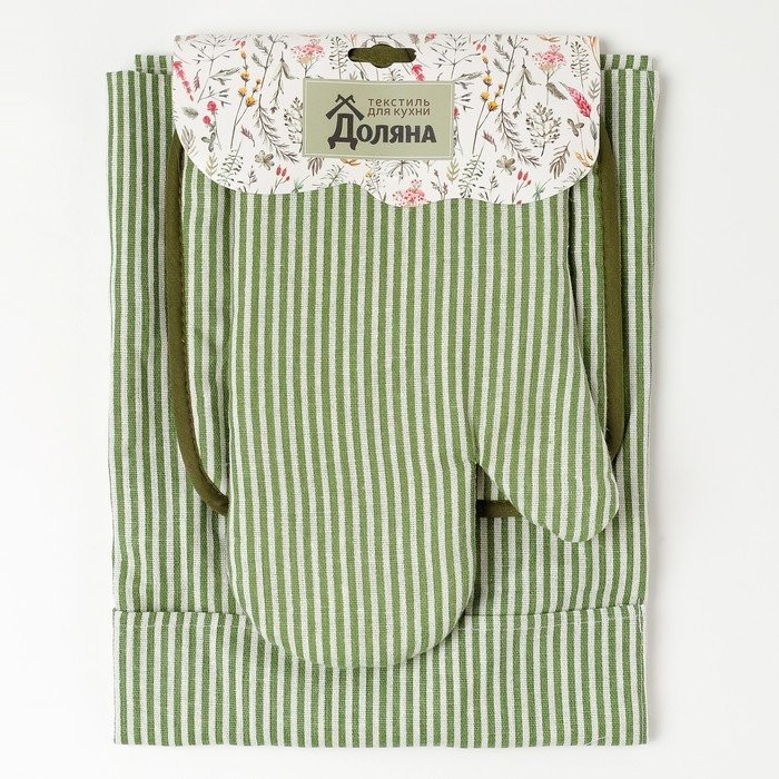 Набор Доляна фартук/прихватка/варежка, Зеленая полоска, 100%пэ, рогожка 200 гр/м